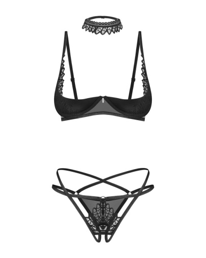 ObsessiveDonarella – 開襠內褲 半罩式胸罩 項圈 三件裝 – 黑色 – 中/大碼